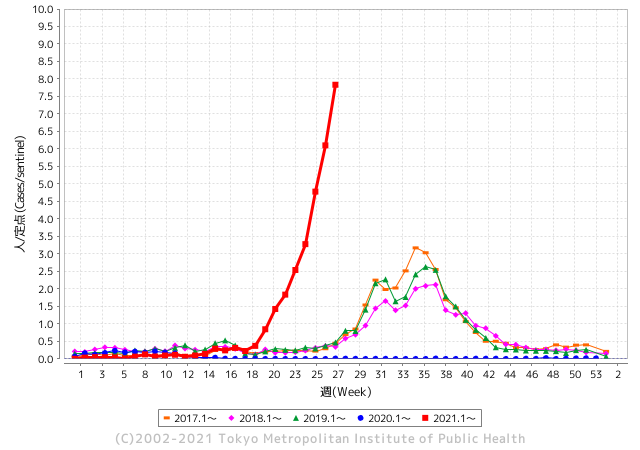 もともと東京では、年末周辺の寒い時期に流行する事が多かったようですが、最近は上記の表のように、春から夏にかけて増加が見られるようです。